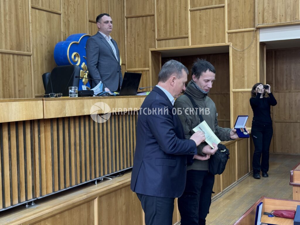 Перед початком розгляду порядку денного міський голова Богдан Андріїв разом із представником цивільно-військового співробітництва Ужгородського РТЦК та СП Віталієм Дячуком вручили державні відзнаки «За оборону України» двом демобілізованим військовослужбовцям – Олегу Сафронову та Олександру Мар’їну.